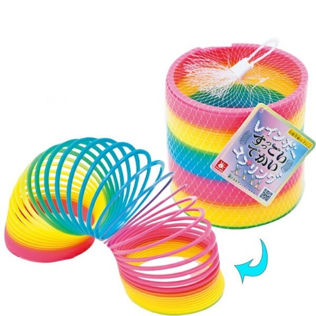 伸ばすと大人の身長にも届いてしまうくらいのサイズ感! レインボーカラーの直径13.5cmの大きなスプリングです。 本体サイズ:(約)直径13.5cm 対象年齢:6歳以上